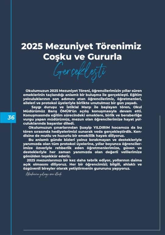 Öğrencilerimizin üretkenliğini, öğretmenlerimizin özverisini ve okulumuzun eğitimdeki yenilikçi yaklaşımını bu sayıda bulabilirsiniz.